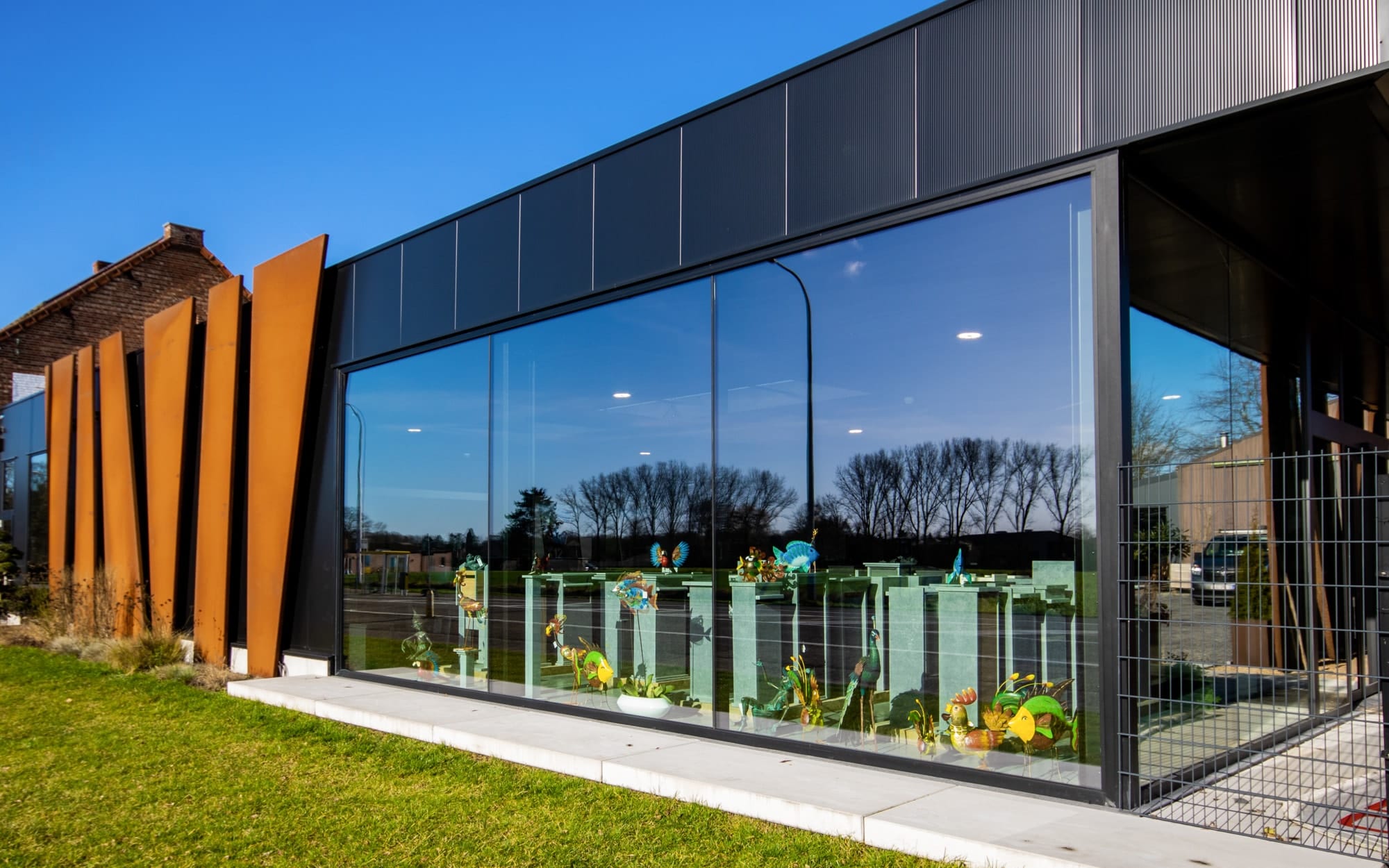 Aan de Steenweg in Herk-de-Stad zijn drie werelden samen onder een dak: het tuincentrum, de wand met brievenbussen van Hof-Shop, en het deel waar Renson-overkappingen 1:1 staan opgesteld. Geen catalogus - opzoekwerk dat je hier letterlijk onder de voeten hebt.